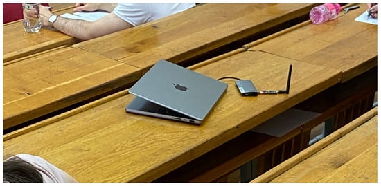 The data set was organized into five smaller Bluetooth captures. The Ubertooth One device was connected to a MacBook set up with the required libraries to run different chipset commands. Requiring only a simple survey capture each time (recording all the LAPs found in a particular area of interest), the current work relied on the following command: ubertooth-rx -z []. Figure 1 shows the hardware setup for collecting the data during the student examination sessions.
