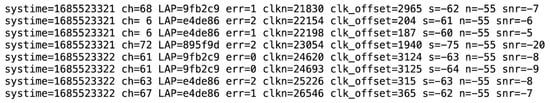 In conclusion, the current research created a framework for capturing and analyzing Bluetooth traffic in an academic examination setting. Further research could improve the system by using multiple monitoring devices and processing data in real time. The Supplementary Materials in this article contain a unique dataset of Bluetooth traffic captures from the examination sessions that can be used by other researchers. This type of data is difficult to generate, as examination sessions only take place a few times a year, and increasing the number of capture sessions causes participants to turn off their devices due to data access concerns, making this a critically important step in this research field.