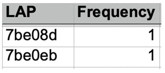 It is important to note that most of the LAPs were detected only once, a sample of which is shown in Figure 5. This means that there might have been a certain percentage of false positives among these captures. According to the official Ubertooth One documentation, whenever a LAP is detected more than once, the Ubertooth One device has successfully detected a Bluetooth transmission.