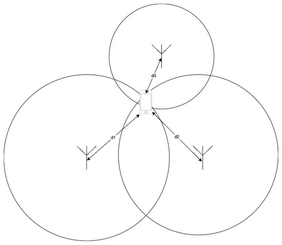 The mathematical technique used to accurately determine the position of an object, based on several fixed and known recording locations, is called multilateration []. In the case when the signal is received in three different locations, the process is called trilateration, which is presented in Figure 7. The procedure solves a system of non-linear equations described by the format shown in Equation (2), where n is the number of points where the sniffing device was positioned: