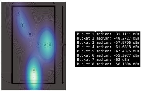 Based on this information, a heatmap distribution can be established to visualize the distribution of the signal. It is built upon a mathematical model of a Kernel Density Estimation—a sum of Gaussian Distributions. At the coordinates where the signal was stronger, the distribution peak was higher and, subsequently, the marker on the physical room layout had a brighter color, as shown in Figure 8.