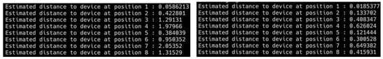 Analyzing the data sheets of the most frequently used smartphones (taking into consideration both iOS- and AndroidOS-powered devices), the average transmission power of a device was computed at around −61.75 dBm, with a rate of tolerance of 10%. It is important to mention that there is no difference between the collected advertisement data of iOS and Android devices, as the same communication protocol is used to send the Bluetooth data frames, regardless of how it is implemented in the proprietary firmware of the devices. Two sets of distances were estimated, from the lower bound of −55 dBm to the higher bound of −65 dBm of the transmission power. Having this information, the distance to the device with LAP 5f744e could be estimated at every capture location. Figure 10 shows the recorded distances to the device with the LAP value 5f744e.